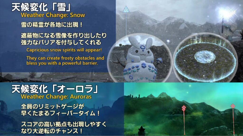 - 雪:雪の精霊が出現し、遮蔽物や強力なバリアを付与